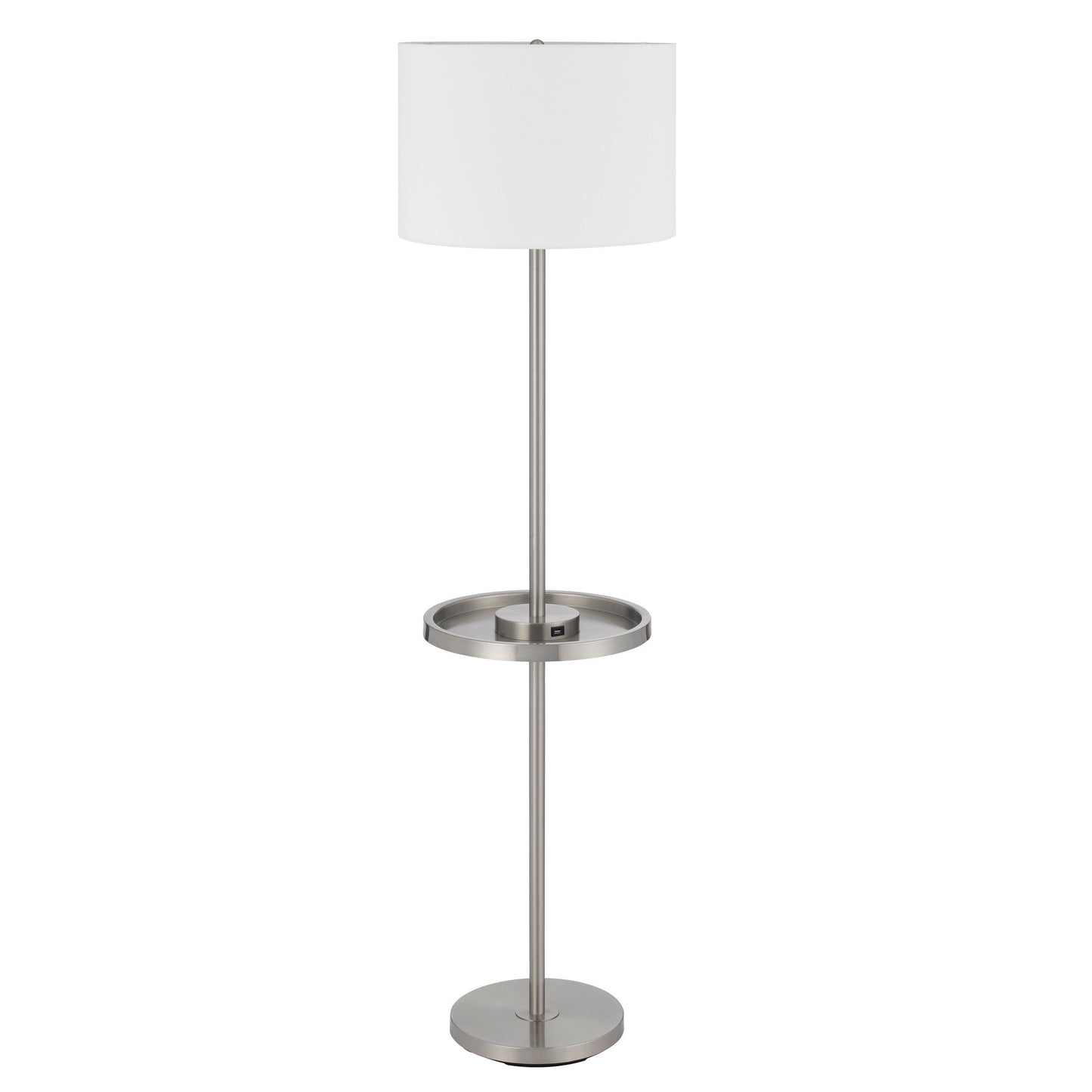 - Crofton metal floor lamp with metal tray table and 2 USB charging ports and a weight base.